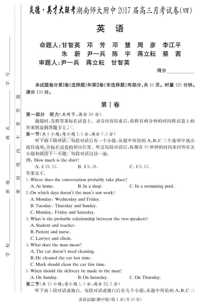 【英語】炎德英才大聯(lián)考2017師大附中高三4次月考