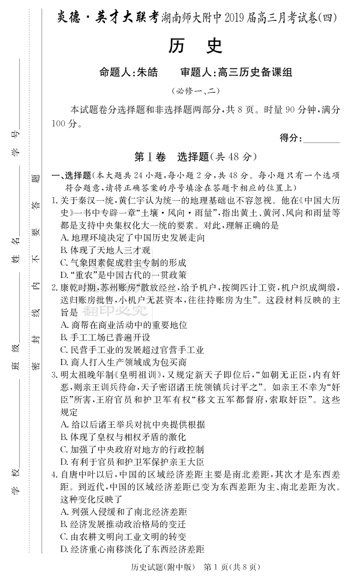 2025長郡中學新高考考前小題沖刺訓練·歷史