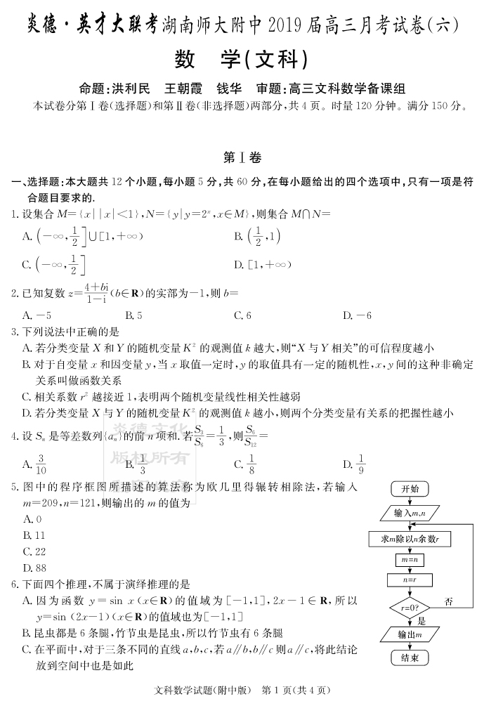 【文數(shù)】炎德英才大聯(lián)考2019師大附中高三6次月考