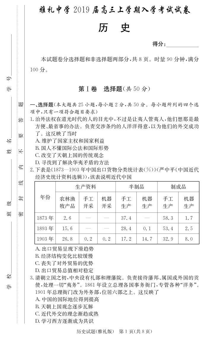 2025長郡中學新高考考前小題沖刺訓練·歷史
