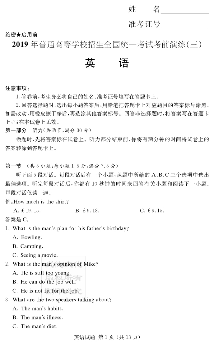 下一篇:【語文】2019年普通高等學校招生全國統一考試考前演練(三)