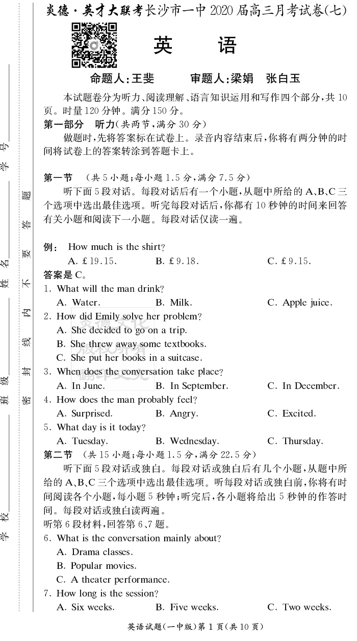 【英語(yǔ)】炎德英才大聯(lián)考2020屆長(zhǎng)沙市一中高三7次月考