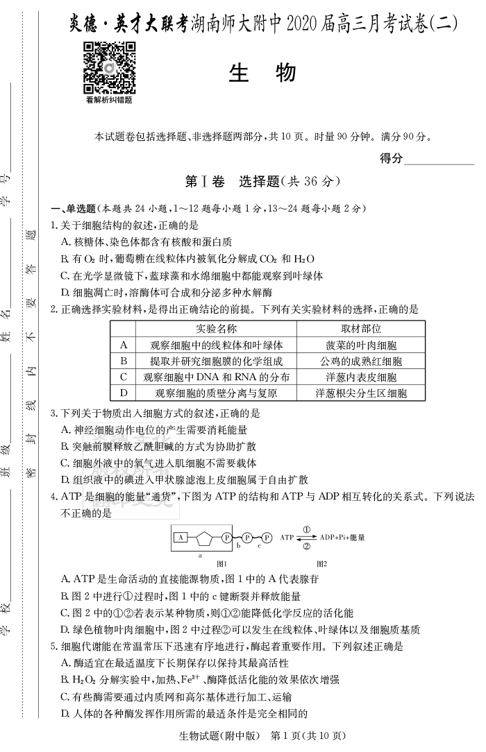 【生物】炎德英才大聯(lián)考2020屆師大附中高三2次月考