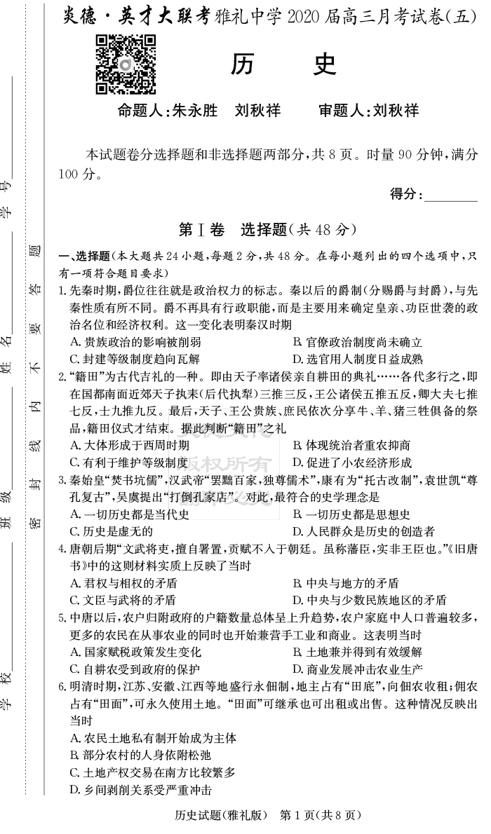 2025長郡中學新高考考前小題沖刺訓練·歷史