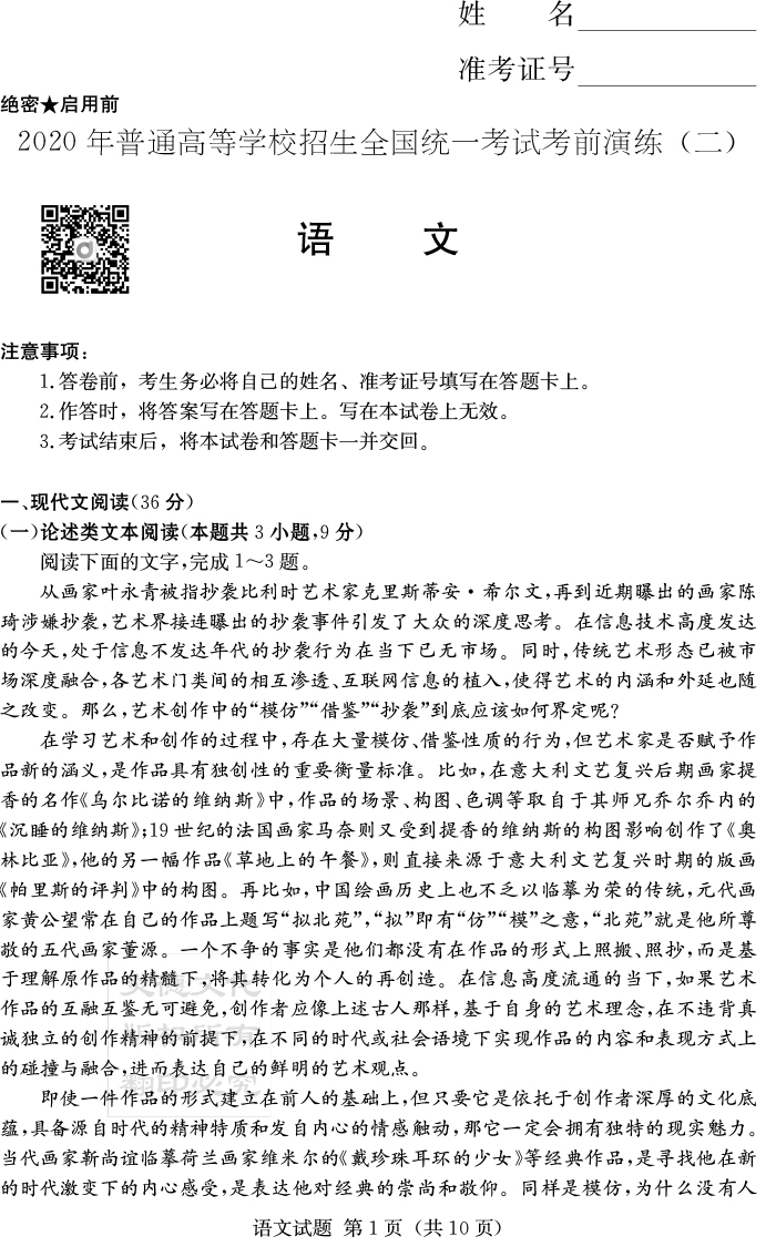 上一篇:【英語】2020年普通高等學校招生全國統(tǒng)一考試考前演練(二)