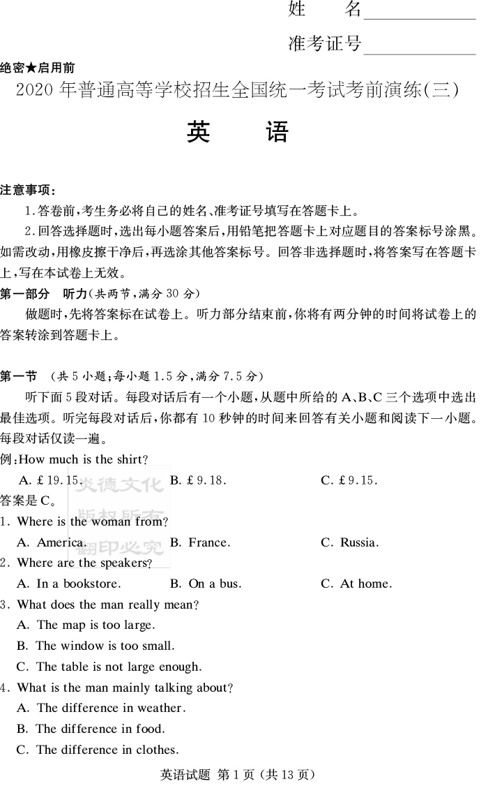 【英語】2020年普通高等學(xué)校招生全國統(tǒng)一考試考前演練(三)