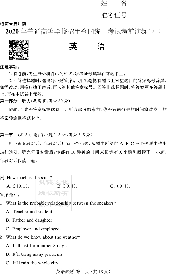 下一篇:【語文】2020年普通高等學校招生全國統一考試考前演練(四)