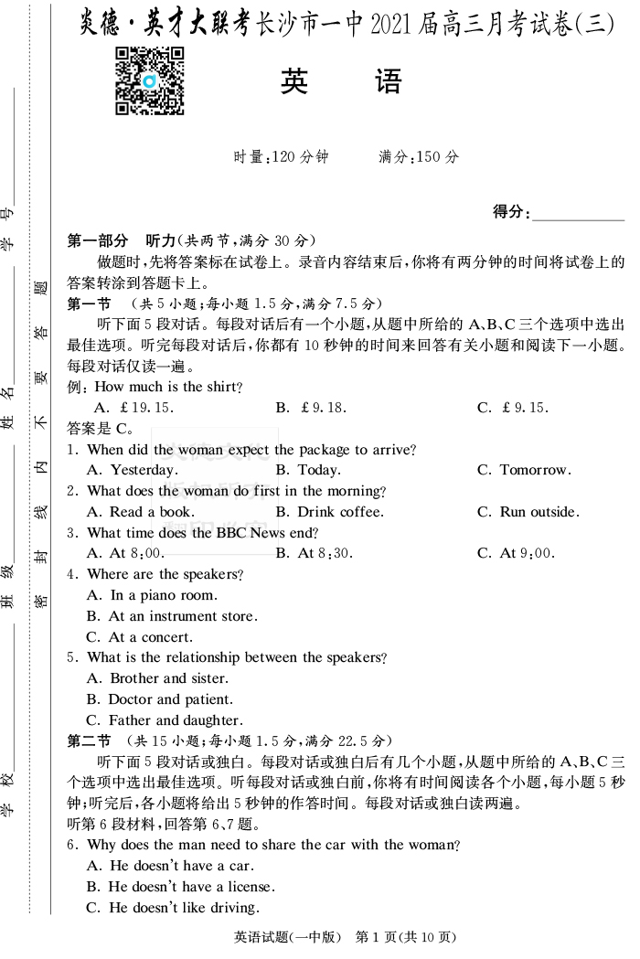 【英語】炎德英才大聯(lián)考2021屆長沙市一中高三3次月考