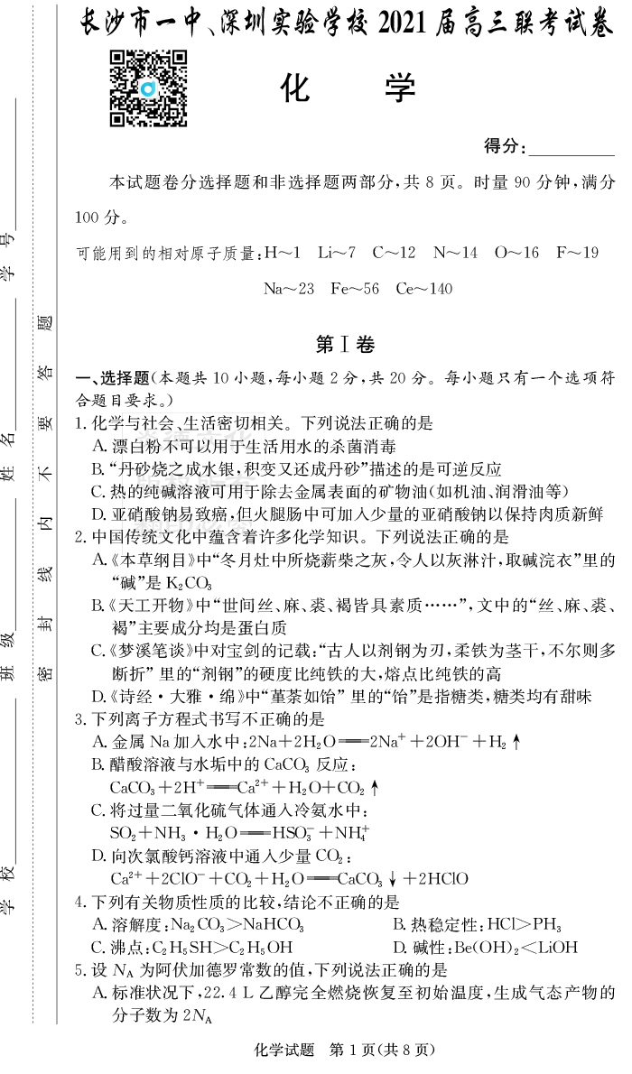 2025長郡中學新高考考前小題沖刺訓練·化學