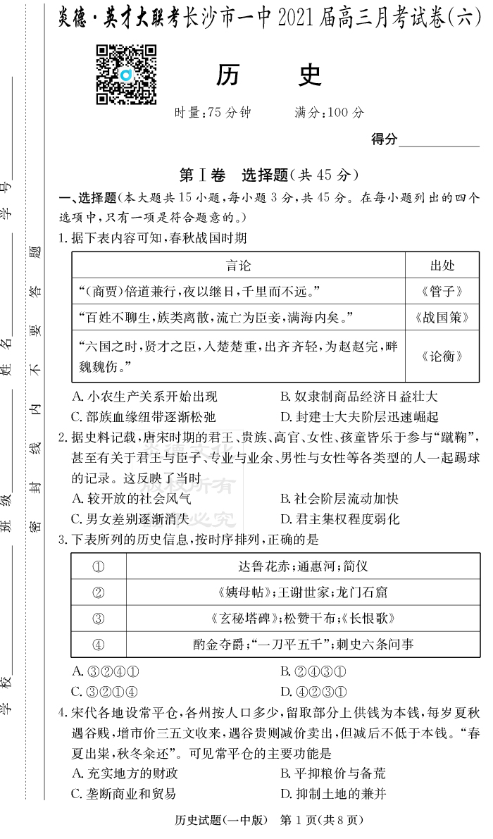 2025長郡中學新高考考前小題沖刺訓練·歷史