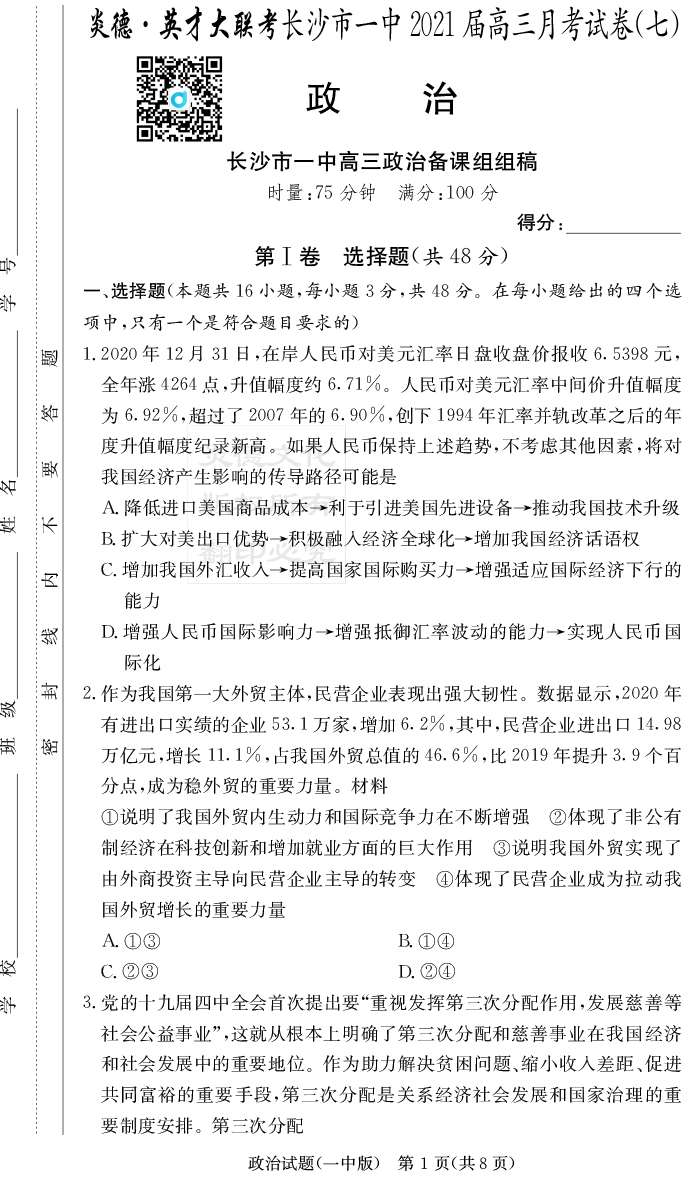 2025長郡中學新高考考前小題沖刺訓練·政治