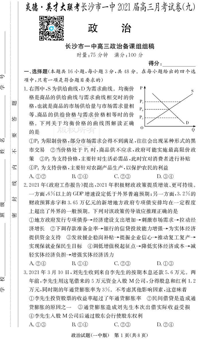 2025長郡中學新高考考前小題沖刺訓練·政治