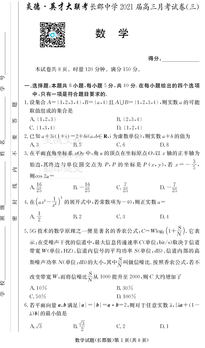 2025長郡中學新高考考前小題沖刺訓練·數學