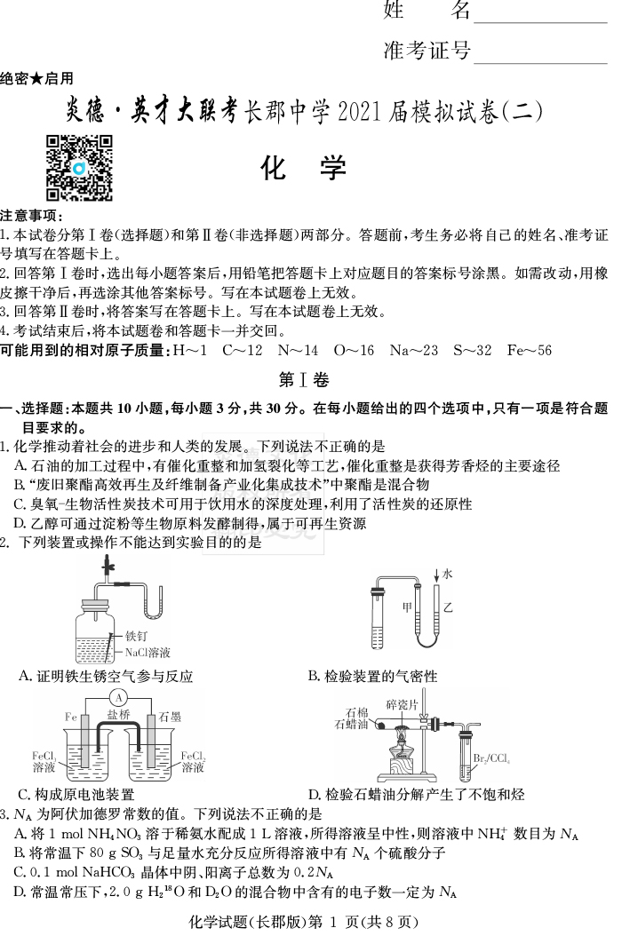 2025長郡中學新高考考前小題沖刺訓練·化學