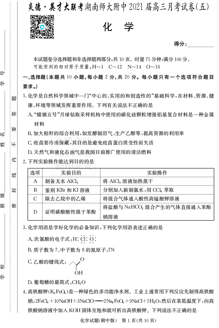 2025長郡中學新高考考前小題沖刺訓練·化學