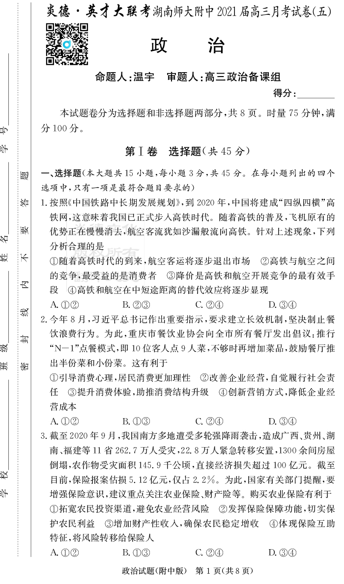 2025長郡中學新高考考前小題沖刺訓練·政治