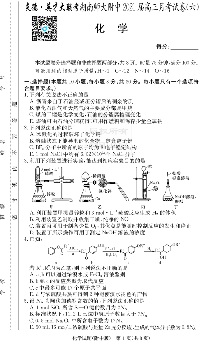 2025長郡中學新高考考前小題沖刺訓練·化學