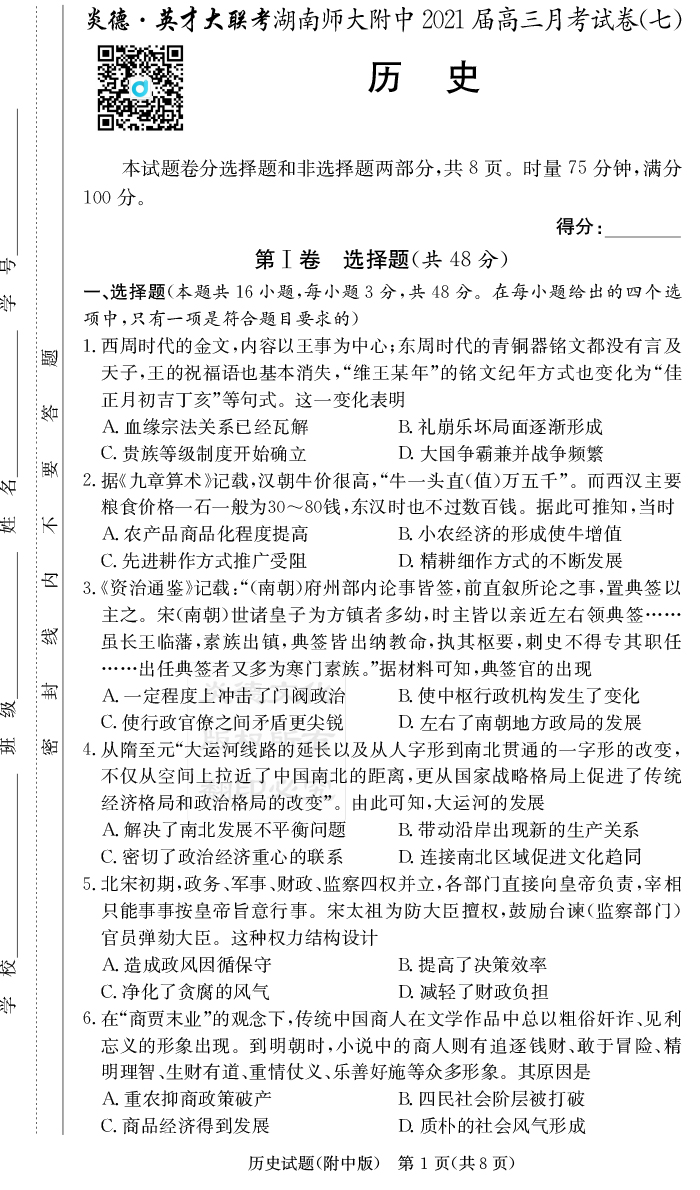 2025長郡中學新高考考前小題沖刺訓練·歷史