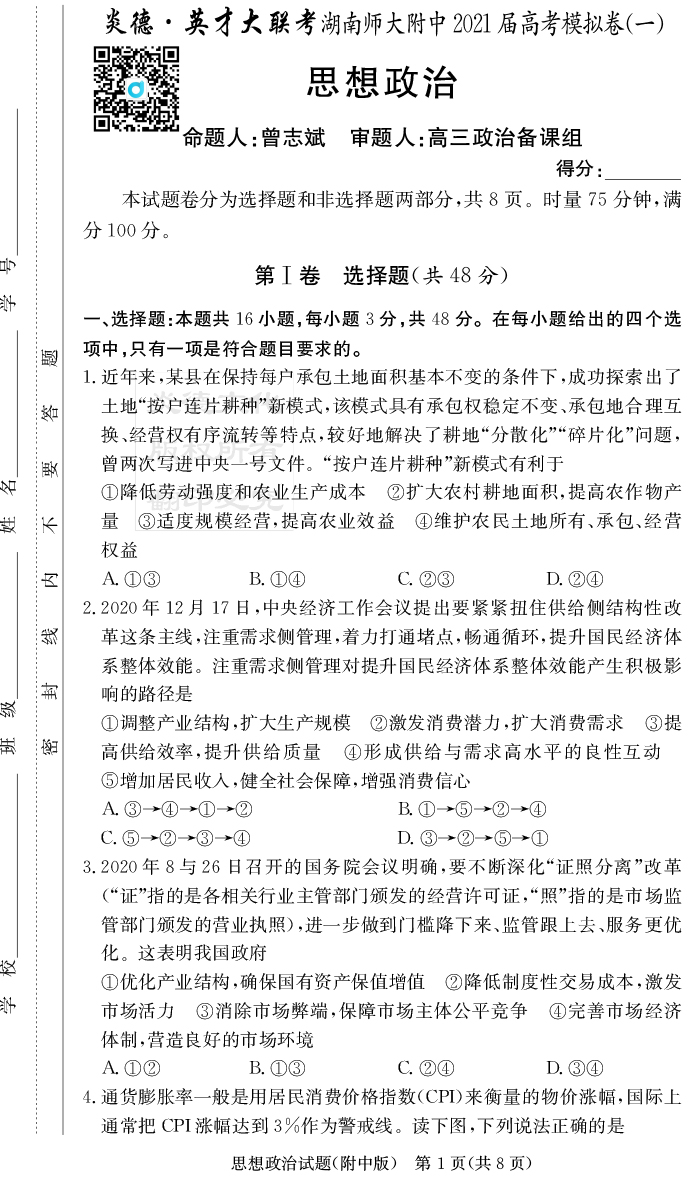 2025湖南師大附中新高考考前小題訓練·政治
