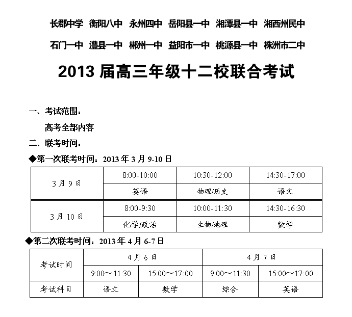 2013屆高三年級(jí)十二校聯(lián)合考試時(shí)間安排