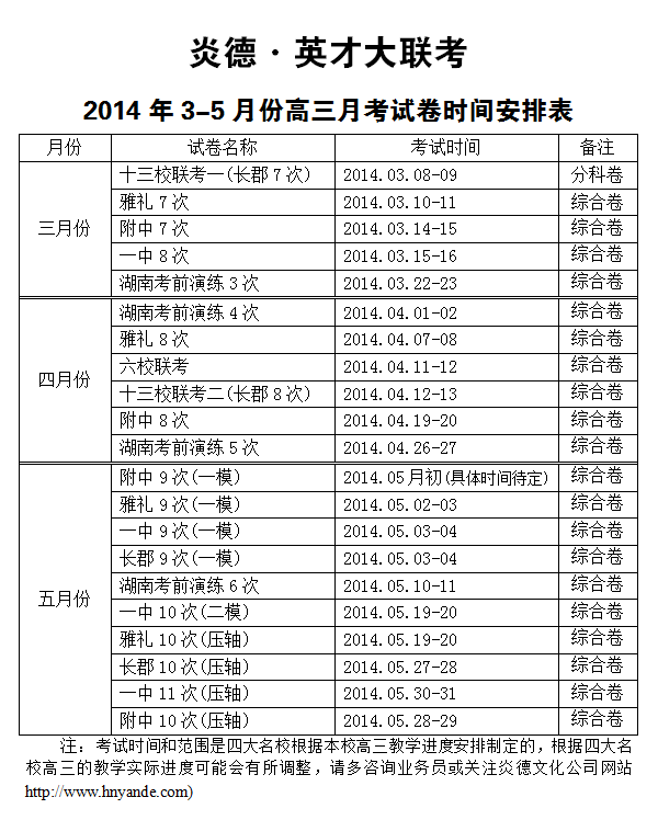 炎德英才大聯(lián)考2014年3-5月份高三月考時(shí)間安排表