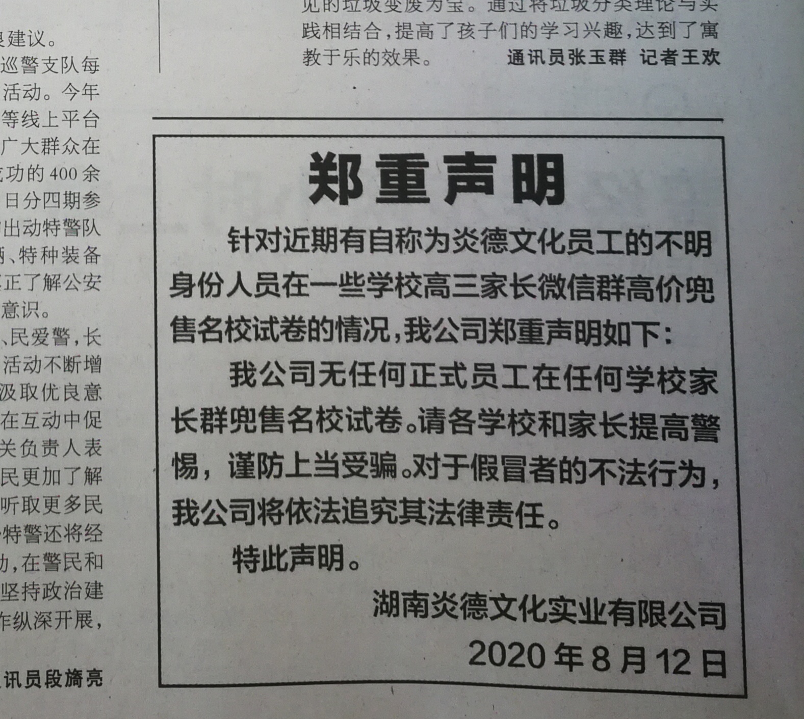 針對近期有自稱為炎德文化員工的不明身份人員在一些學(xué)校高三家長微信群高價兜售名校試卷的情況,我公司鄭重聲明如下: