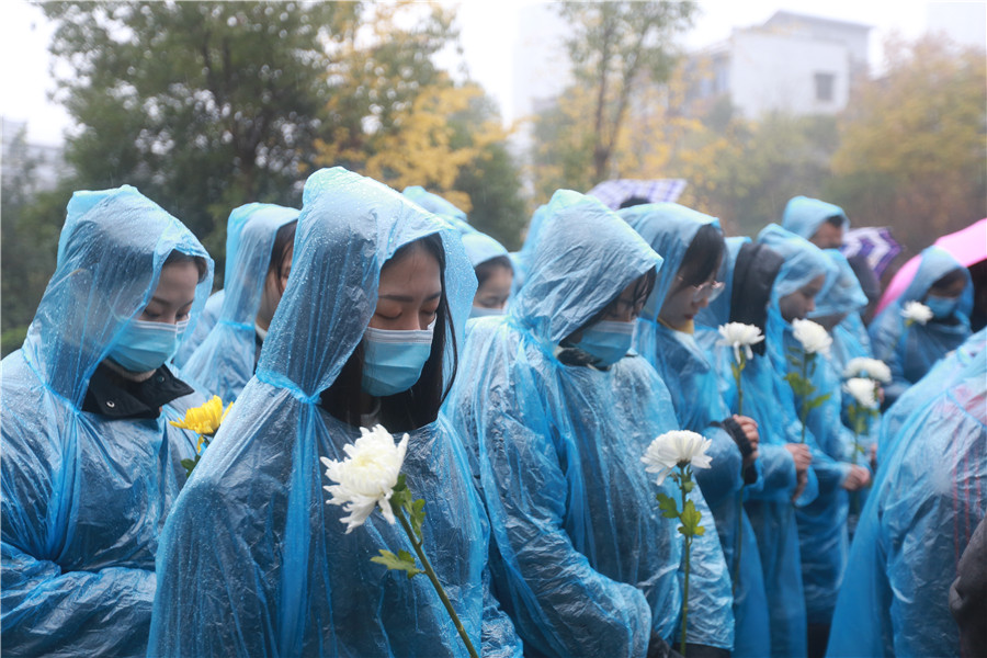 參加活動的市民向抗戰英烈和在抗日戰爭中遇難的平民默哀悼念,并獻上白菊表達哀思。