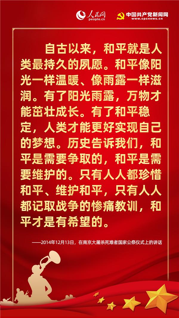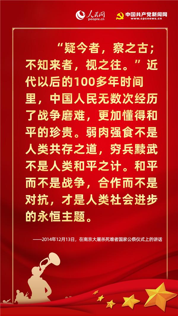 歷史不僅關(guān)乎過去,更關(guān)乎現(xiàn)在和未來。紀(jì)念歷史不是為了咀嚼苦難、延續(xù)仇恨,而是為了重申和平與正義的價(jià)值,從歷史中汲取智慧,獲得開創(chuàng)未來的精神力量。在七七事變83周年的今天,人民網(wǎng)·中國共產(chǎn)黨新聞網(wǎng)梳理十八大以來習(xí)近平總書記有關(guān)“戰(zhàn)爭(zhēng)與和平”的重要論述,讓我們一起“銘記歷史、緬懷先烈、珍視和平、警示未來”。