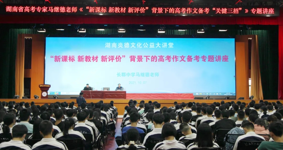 “乘騏驥以馳騁兮,來吾道夫先路。”金秋十月,大美校園,風(fēng)送桂香,最是高三學(xué)子發(fā)奮時。2021年10月7日下午,望城二中攜手湖南炎德文化實業(yè)有限公司,舉辦主題為“新高考背景下高考命題特點及沖刺策略(語文學(xué)科)”的教育服務(wù)公益活動。高三年級全體班主任、語文教師及學(xué)生齊聚俊德樓三樓報告廳,在特邀專家馬繼德老師的引領(lǐng)下,探尋高考作文備考之路。