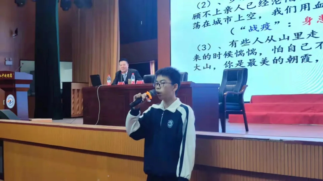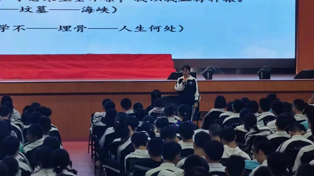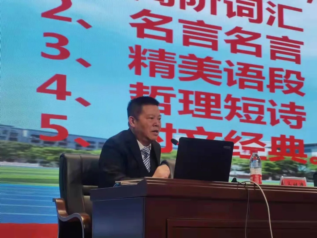 講座伊始,主持人劉滿和副校長向全體師生介紹了本次講座的主講人馬繼德老師:馬繼德老師是長郡中學(xué)特聘高中語文研究員,長郡中學(xué)清北班培訓(xùn)專家,組大組長,省、市高級教師評審專家?guī)煸u委。1994年、1997年先后被市級、省級職稱評審委員會破格晉升為中學(xué)一級、中學(xué)高級語文教師,是長沙市2010年首批晉升的中學(xué)五級教師。曾獲創(chuàng)新杯及葉圣陶杯全國一等獎優(yōu)秀指導(dǎo)教師、市級教學(xué)比武一等獎、市級十佳教師、縣級勞動模范等榮譽,是全國及省中語會授予的作文教學(xué)優(yōu)秀教師。在省級、國家級報刊上公開發(fā)表論文數(shù)十篇,有省級一等獎結(jié)題課題,撰寫高考輔導(dǎo)書籍二百萬余字。近幾年在安徽、江西、湖南、廣東、廣西、湖北等省市縣完成高考備考講座百余場,應(yīng)邀在懷化、婁底、郴州、岳陽、常德、邵陽、永州、湘西、長沙、玉林、柳州、池州、荊州、赤壁、武漢、湖南師范大學(xué)等地完成市級、省級教師培訓(xùn)或高三復(fù)習(xí)研討會講座30余場。每一種卓越身份,每一項高光榮譽,每一個沉甸甸的成就,都昭示著這場講座的含金量。在熱烈的掌聲中,身著正裝、神采飛揚、風(fēng)度翩翩的馬老師開始為時兩個小時的講座。