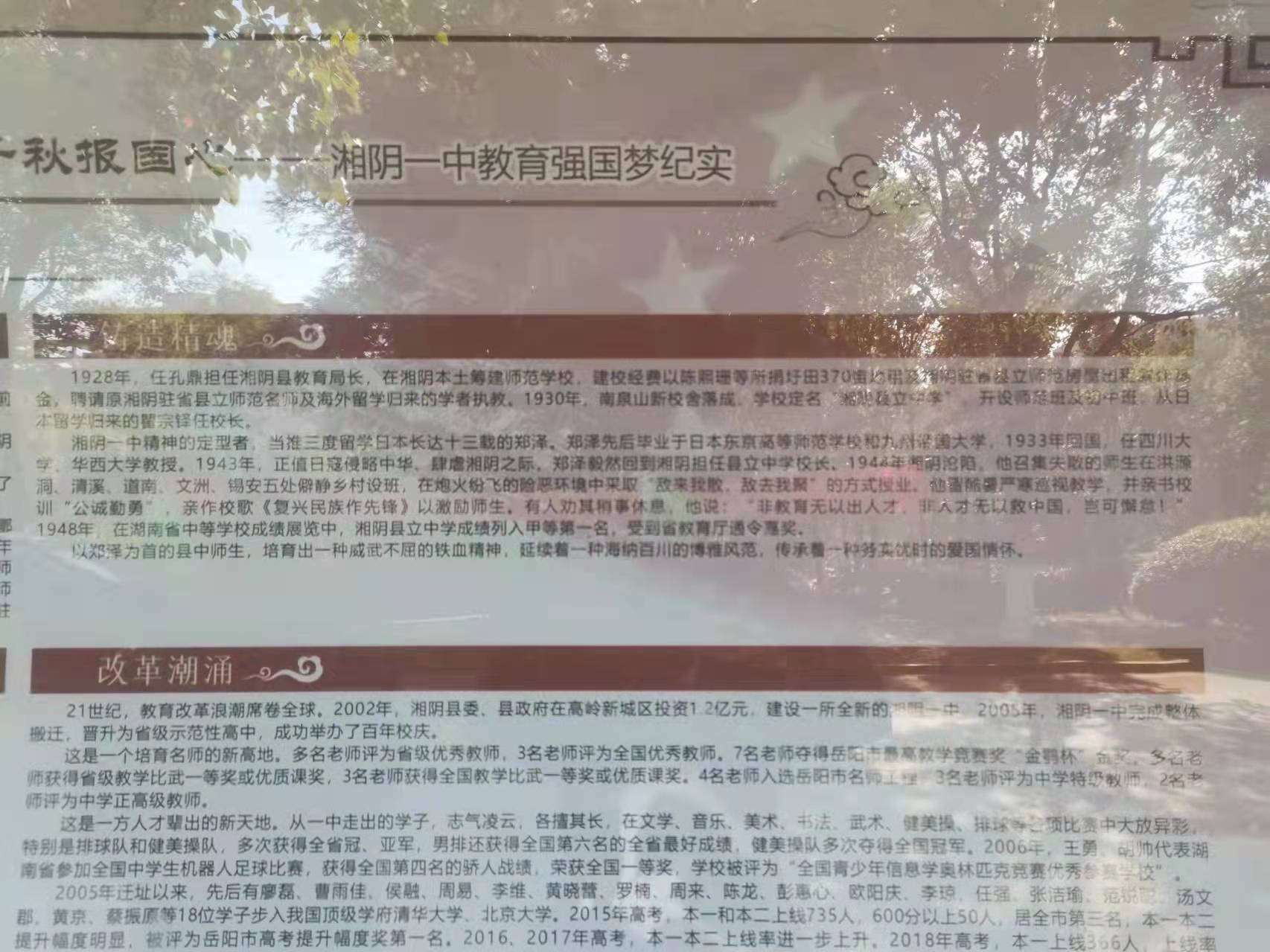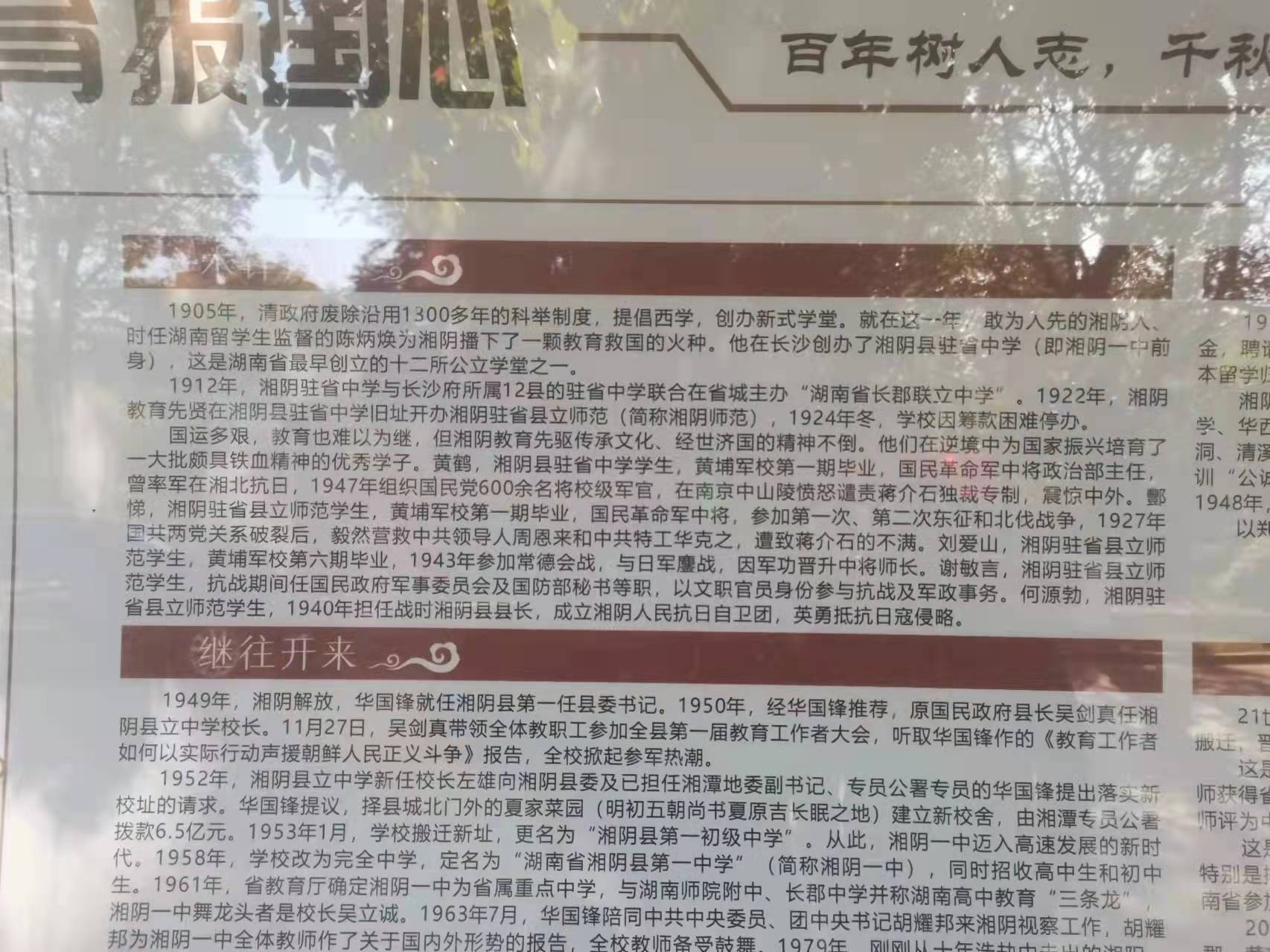 附:湘陰縣第一中學創建于1905年(清光緒32年),始稱"湘陰駐省中學"。當時清政府詔示停止科舉考試,命各省會及府、州、縣籌設高等、中等、初等學堂。湘陰縣教育先輩陳炳煥、仇道南等率先興新學,租賃長沙市南正街唐宅作臨時校舍,招收甲班學生80名。同年12月,購置長沙市北門口羅湘里周幾天房屋改作校舍。