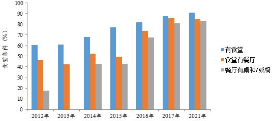 營養改善計劃實施過程中,各地不斷加大食堂建設力度,為推進食堂供餐提供保障。2021年,在11857所監測學校中,90.9%的監測學校有食堂,食堂有餐廳的比例為84.4%,餐廳有餐桌、椅凳的比例為83.1%。監測結果顯示,監測學校中有食堂的比例逐年增高,從2012年的60.6%增長到2021年的90.9%。