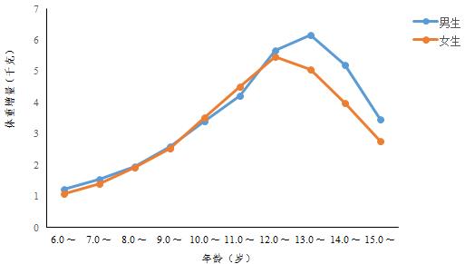 圖2 十年來監測地區6~15歲各年齡段學生平均體重增量