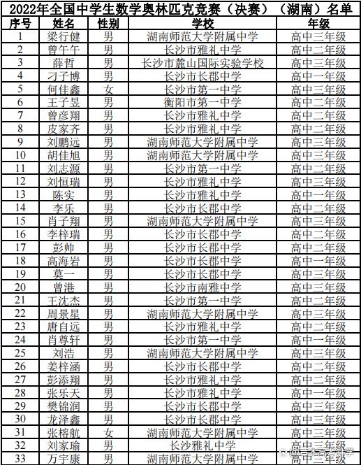 據(jù)中國數(shù)學會發(fā)布的官方公布的名單,今年湖南省進入數(shù)學奧林匹克競賽決賽的人數(shù)有33人。