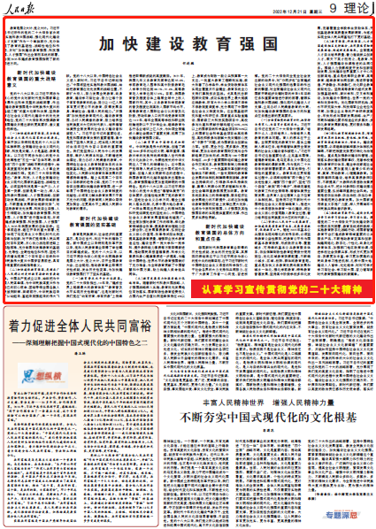 教育是國之大計(jì)、黨之大計(jì)。習(xí)近平總書記所作的黨的二十大報(bào)告首次將“實(shí)施科教興國戰(zhàn)略,強(qiáng)化現(xiàn)代化建設(shè)人才支撐”作為一個(gè)單獨(dú)部分,充分體現(xiàn)了教育的基礎(chǔ)性、戰(zhàn)略性地位和作用,并對(duì)“加快建設(shè)教育強(qiáng)國、科技強(qiáng)國、人才強(qiáng)國”作出全面而系統(tǒng)的部署,為到2035年建成教育強(qiáng)國指明了新的前進(jìn)方向。