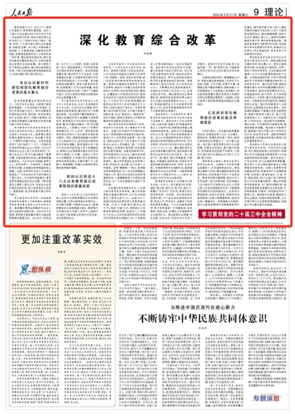 教育是國之大計(jì)、黨之大計(jì),教育興則國家興,教育強(qiáng)則國家強(qiáng)。黨的二十屆三中全會通過的《中共中央關(guān)于進(jìn)一步全面深化改革、推進(jìn)中國式現(xiàn)代化的決定》(以下簡稱《決定》)提出:“教育、科技、人才是中國式現(xiàn)代化的基礎(chǔ)性、戰(zhàn)略性支撐”,并從深入實(shí)施科教興國戰(zhàn)略、人才強(qiáng)國戰(zhàn)略、創(chuàng)新驅(qū)動發(fā)展戰(zhàn)略,統(tǒng)籌推進(jìn)教育科技人才體制機(jī)制一體改革,健全新型舉國體制,提升國家創(chuàng)新體系整體效能出發(fā),對深化教育綜合改革作出系統(tǒng)部署。我們要深入學(xué)習(xí)貫徹全會精神,通過深化教育綜合改革,不斷為加快建設(shè)教育強(qiáng)國提供動力,有效支撐引領(lǐng)中國式現(xiàn)代化。