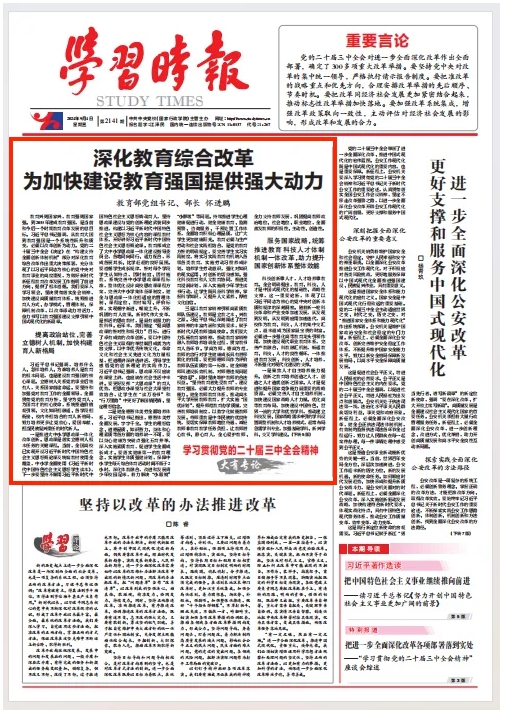 教育興則國家興,教育強(qiáng)則國家強(qiáng)。到2035年建成教育強(qiáng)國,是當(dāng)前和今后一個(gè)時(shí)期教育改革發(fā)展的總目標(biāo)。習(xí)近平總書記強(qiáng)調(diào),從教育大國到教育強(qiáng)國是一個(gè)系統(tǒng)性躍升和質(zhì)變,必須以改革創(chuàng)新為動(dòng)力。黨的二十屆三中全會(huì)《決定》在“構(gòu)建支持全面創(chuàng)新體制機(jī)制”部分對(duì)深化教育綜合改革作出重大決策部署,充分體現(xiàn)了以習(xí)近平同志為核心的黨中央對(duì)教育事業(yè)的高度重視,為做好新時(shí)代新征程教育改革發(fā)展工作指明了前進(jìn)方向、提供了根本遵循。我們要深入學(xué)習(xí)領(lǐng)會(huì)、堅(jiān)決貫徹落實(shí)全會(huì)精神,加快建設(shè)高質(zhì)量教育體系,統(tǒng)籌推進(jìn)育人方式、辦學(xué)模式、管理體制、保障機(jī)制改革,以改革添動(dòng)力增活力,奮力書寫以教育強(qiáng)國建設(shè)支撐引領(lǐng)中國式現(xiàn)代化的新篇章。